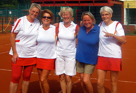 Susanne Haß hatte gegen ihr Gegnerin Geesche Rzepka im ersten Satz etwas Mühe, ein knappes Ergebnis mit 7:5. Im zweiten Satz erhöhte Susanne den Druck und kam zu ihrer gewohnten Spielweise. So endete der zweite Satz auch klar mit 6:1 für sie. Zeitgleich trat Wiebke Janzen gegen Elke Puck auf dem Nebenplatz an. Nach langen Ballwechseln am Ende doch ein klares Ergebnis mit 6:2 und 6:2 für Wiebke. Mit nun 2:0 Punkten war der Grundstein für einen eventuellen Aufstieg hiermit gelegt. In den nächsten beiden Spielen trat Anke Merkens gegen Renate Rupieper an. Auch hier war der erste Satz eine knappe Angelegenheit. Anke setzte sich dann doch mit 7:5 durch und machte im zweiten Satz bei einem konzentriertem Spiel mit 6:2 den dritten Punkt für Schönberg klar. Nun hatte im letzten Einzel Karin Cornelsen alles in der Hand den Aufstieg schon nach den Einzeln für ihr Mannschaft zu erreichen. 6: 3 gewann sie den ersten Satz, doch ihre Gegnerin Ingrid Reichert sicherte sich das zweite Match mit 6:3 für Neumünster-Wittorf. Sehr spannend und eng war es im entscheidenen dritten Satz. Mit einem 6:4 Sieg holte sich Karin den noch fehlenden vierten Punkt für den TCP Schönberg, der Aufstieg in die Verbandsliga war jetzt schon geschafft.